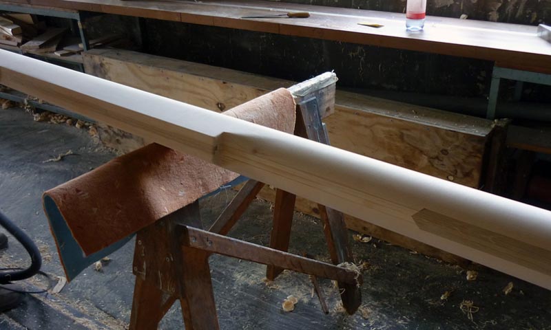 Maßgebend für den Neubau: der alte Mast Der Neubau dieses Peitschenmastes musste sich zwangsläufig am Vorbild des alten Mastes orientieren. Das Mastloch im Deck des Bootes und die Aufnahme für den Mast im Kielschwein lieferten dazu die Vorgaben. Außerdem, und das war ganz besonders wichtig, waren die Vorliekkurve des Großsegels und der Liektaudurchmesser zu berücksichtigen. Da die Beschläge des alten Mastes übernommen werden konnten, war auch der Querschnitt festgelegt. Die Wandstärken des alten Mastes wurden überprüft, und, wo nötig, beim Neubau geändert. Der Mast hat am größten Durchmesser ein Kastenmaß von 147 x 106 mm. Worauf es beim Mastbau sonst noch ankommt Der Mastbau ist eine besondere Spezialität unserer Werkstatt. Das gilt nicht nur für die Massivbauweise, sondern ganz besonders, wenn es um die Anfertigung von hohlen Masten und Spieren jeglicher Art geht. Wir verarbeiten feinjährige Fichte oder Sitka–Spruce und liefern maßgefertigte Beschläge aus V2A gleich mit. Hochwertige Holzmasten sind komplizierte Gebilde, bei deren Konstruktion in erster Linie die Segelfläche eine wichtige Rolle spielt. Von deren Größe ist der maximale Mastquerschnitt abhängig, vom Mastquerschnitt wiederum die Wandstärke des Mastes. Der größte Querschnitt des Mastes liegt gewöhnlich bei 1/3 der Gesamtlänge, zum Mastfuß und vor allem zum Masttop hin verjüngt er sich. Mit dieser Verringerung des Querschnitts geht natürlich auch eine ständige, fliessende Veränderung der Wandstärke des Mastes einher. Grundlage der Neuanfertigung eines Mastes ist daher eine detaillierte Zeichnung mit Querschnitten im Maßstab 1:1, aus denen u.a. Schablonen zur sicheren Kontrolle der unterschiedlichen Wandstärken angefertigt werden können. Außerdem sind hier zum Beispiel die Positionen der Hartholzverstärkungen im hohlen Innern des Mastes festgelegt. Diese dürfen wiederum den innenverlaufenden Fallen oder einem Kabel-Leerrohr nicht im Wege sein. Mastprofile können kastenförmig, rund, oval oder tropfenförmig sein, möglich sind ferner Schienen zur Aufnahme des Segels oder eine eingearbeitete Keep für das Liektau des Segels. Allen gemeinsam ist: ihre Herstellung erfolgt, bis auf den Zuschnitt des Rohmaterials, fast ausschliesslich von Hand, mit verschiedenen Hobeln, selbstgebauten Profilhobeln und auch mit dem Ziehmesser.