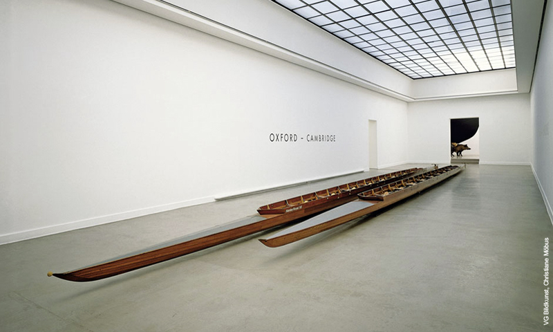 ![]() Wettstreit ohne Anfang und Ende Im Kern besteht die Installation "Oxford - Cambridge" aus zwei historischen Renngig-Achtern (Mrs. Bean, 39 x 2390 x 63,5 cm, Henley Royal 93, 39 x 1950 x 61 cm). Als Teil eines kinetischen Objekts sind beide Boote beweglich: Auf Führungsschienen bewegen sie sich unentwegt gegeneinander vorwärts und rückwärts, angetrieben von zwei verdeckt montierten Motoren. Restauration mit besonderen Aspekten Die Vorbereitung der beiden Rennachter war zunächst einmal nichts anderes als eine ganz normale Restauration. Zusätzlich mussten beide Boote allerdings so vorbereitet werden, dass sie für den Transport zerlegt und später, für das Auge des Betrachters unsichtbar, an je zwei versetzt angeordneten Trennstellen wieder zusammengefügt werden konnten.