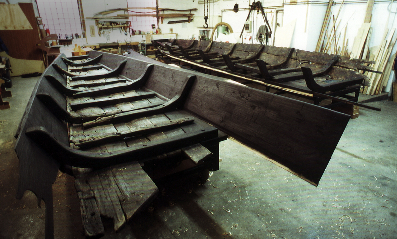 Der Fund Die Überreste des karolingischen Flusskahns wurden zufällig bei Baggerarbeiten in einer Kiesgrube bei Kalkar-Niedermörmter gefunden. Die wissenschaftliche Untersuchung des Fundes ergab, dass der Kahn um 800 nach Christus, also etwa zur Zeit Karls des Großen entstand. Kähne dieses Typs sind am Unterlauf des Rheins und seiner Nachbarflüsse bis in die Mitte des 19. Jahrhunderts gebaut und genutzt worden. Die Rekonstruktion Für die Präsentation im Museum musste fast die Hälfte des offenen Bootes ergänzt werden, da Bauteile (bereits vor der Bergung Anfang der 90er Jahren) verloren gegangen waren. Trotz der fehlenden Teile konnte die ursprüngliche Bauweise durch den Bau eines Modells im Maßstab eins zu zehn rekonstruiert werden. Grundlage der Rekonstruktion waren die insgesamt 45 erhaltenen Einzelteile der Beplankung und 28 von ehemals 37, zum Teil nur noch in Bruchstücken verfügbare Spanten, die mit Holzdübeln verzapft waren. Auch die Abmessungen, die ursprünglichen Winkel der Bordwände und die Wölbung der Bodenplanken (Kielsprung) konnten anhand des Modellbaus ermittelt werden. Das Rheinschiff Niedermörmter wurde nach der Konservierung mit PEG-Wachs auf einer von uns angefertigten stählernen Unterkonstruktion aufgebaut und befestigt. Als Zeugnis der regionalen Kulturgeschichte ist es seit 2003, nach einer Zwischenstation im Römisch-Germanischen Museum Köln, fester Bestandteil der Ausstellung des Rheinischen Landesmuseums in Bonn.