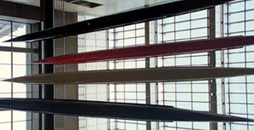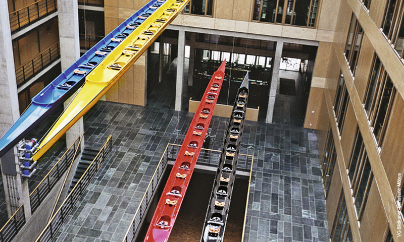 Nach dem Zufallsprinzip und geräuschlos bewegen sich die vier 17 Meter langen Rennachter auf und ab. Sie gehören zu einer Installation mit dem Titel "auf und ab und unterwegs", die von Christiane Möbus 2001 für das Jakob-Kaiser-Haus des Deutschen Bundestages entwickelt wurde. Als "Luftboote" wurden sie bezeichnet, ihre Farben (schwarz, rot, gelb und blau) gelegentlich auch politisch interpretiert. |